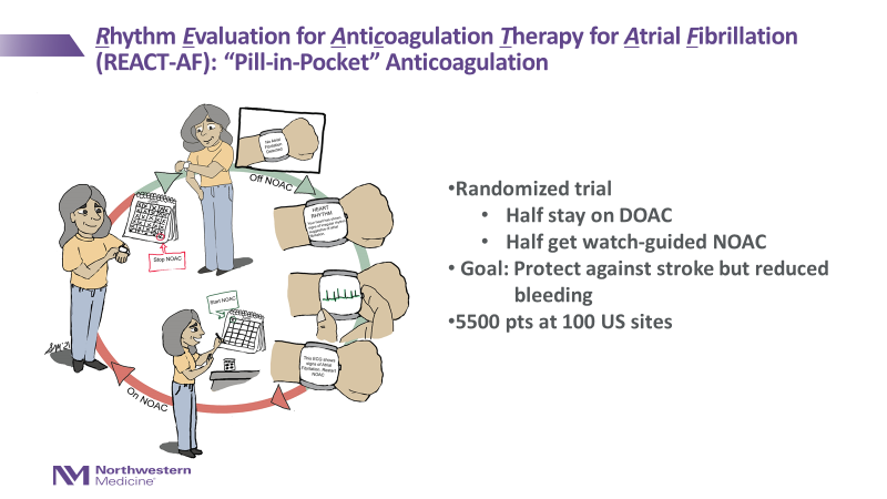 The Rhythm Evaluation for AntiCoagulaTion With Continuous Monitoring of Atrial Fibrillation (REACT-AF) Study will compare continuous use of direct oral anticoagulants (DOACs) versus use of DOACs only for 30 days after an afib episode has been detected by the study’s AF-sensing Smart Watch (AFSW).