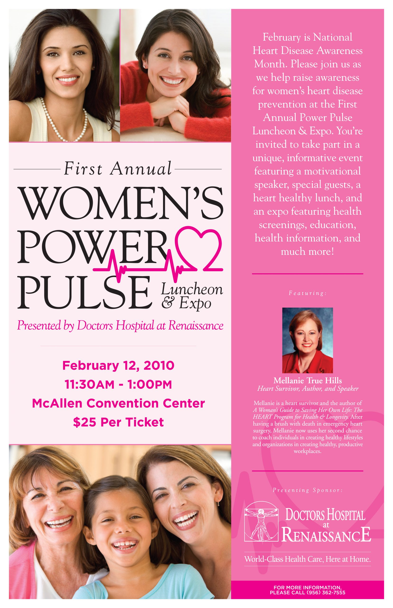 StopAfib.org CEO Mellanie True Hills will be keynoting the First Annual Women’s Power Pulse Luncheon & Expo, sponsored by Doctors Hospital at Renaissance. Both the luncheon and the expo will take place on Friday, February 12, 2010 at the McAllen Convention Center. The expo will go from 10:00 AM – 2:00 PM, with musical guest Chris Marshall providing entertainment. The luncheon will occur from 11:30 AM – 1:00 PM. Mellanie will inform women who attend the luncheon about heart disease prevention, stress-management and living a healthier lifestyle. Luncheon tickets cost $25 and provide access to the expo as well.