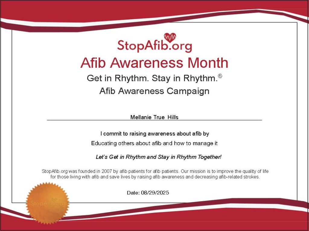 Once you submit the form, look for an email in your inbox to download your personalized certificate of commitment. To celebrate National Afib Awareness Month, please take a picture of yourself with your certificate and share it on Facebook, Instagram, or Twitter. Tag @StopAfib and include the following hashtags: #AfibAwarenessMonth #StopAfib #GetInRhythm25