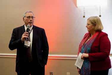 Dr. Prystowsky and Mellanie True Hills announcing the renaming of the award to the Eric N. Prystowsky, MD Advocate for Patients Award at the reception at the 2016 Get In Rhythm. Stay In Rhythm.™ Atrial Fibrillation Patient Conference